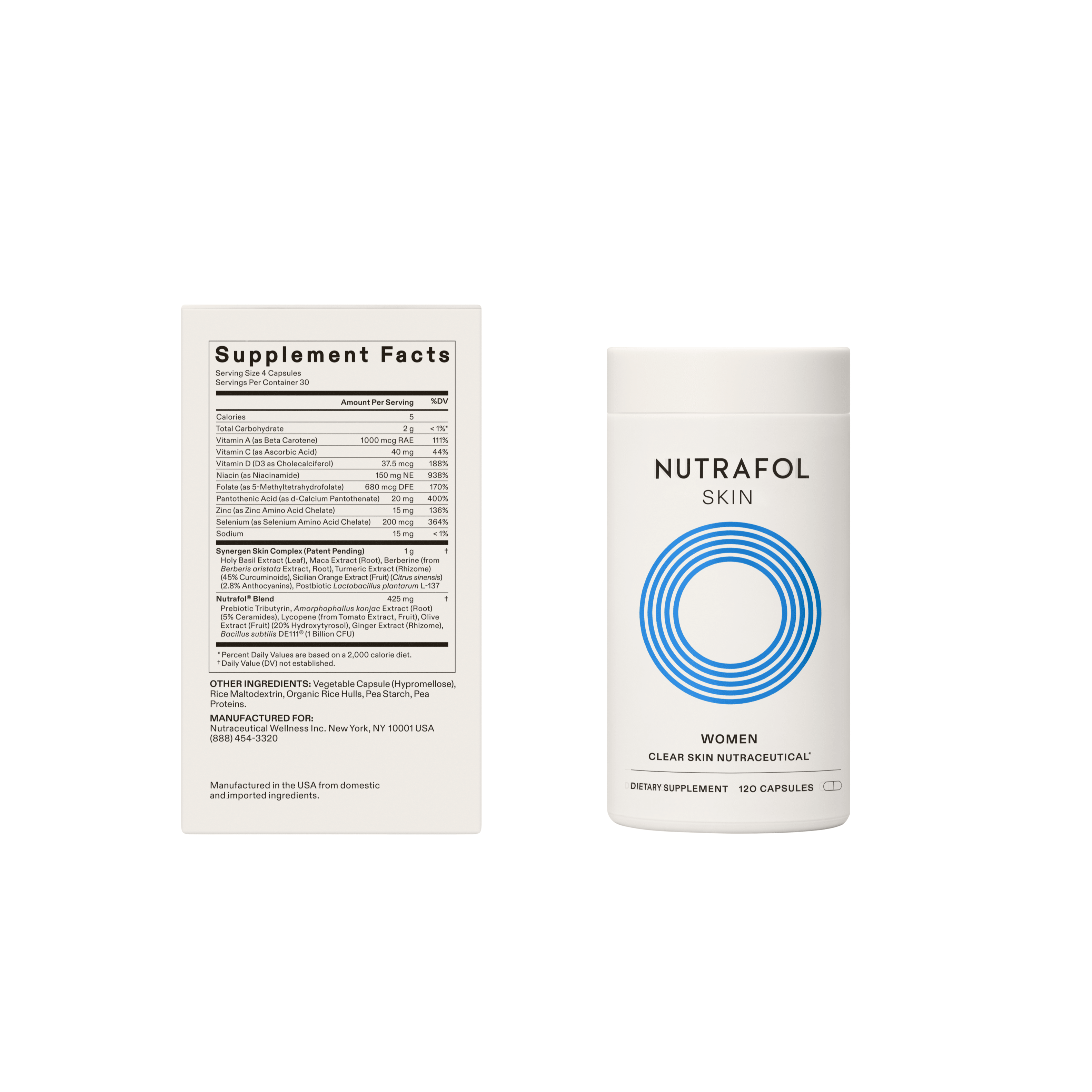 Nutrafol Clear Skin is a professional-strength supplement that targets bio-specific causes of acne for women by using Synergy Skin Complex to support skin health. Physician-formulated with a specific blend of vitamins, minerals, and natural ingredients that address causes of acne breakouts by targeting the root internal causes.