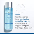 - Gentle essence toner with malachite extract that helps to detox skin